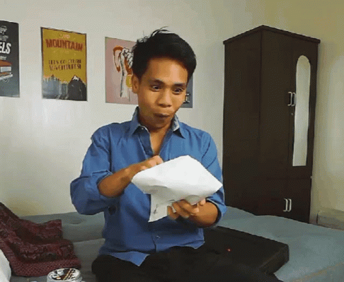 Yamyam Gucong reacts with excitement and a big smile while opening his mail, looking surprised and happy.
