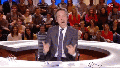 Yann Barthès, host of Quotidien, claps during his show, surrounded by an audience.