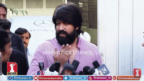 Rocking Star Yash addresses the media, speaking passionately in front of microphones and reporters.