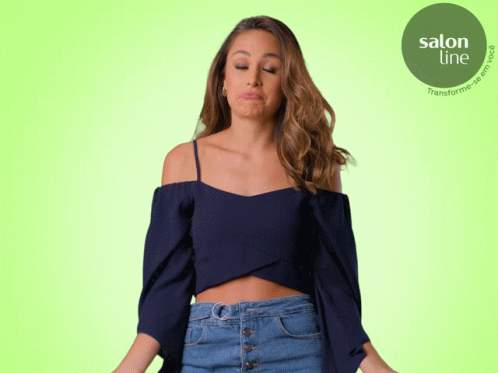 Yasmin Castilho makes a funny, shrugging face in front of a green background, promoting Salon Line products.