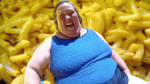 Honey Boo Boo laughs joyfully while sitting in front of a massive pile of macaroni and cheese.