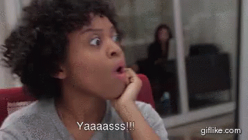 A person with a surprised and excited expression exclaims "Yaaaasss!!!" with their mouth open.