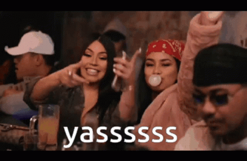 Emmalyn and friends celebrating, with 'yasssss' text on screen, capturing a fun party moment.