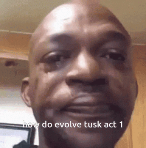 A crying man's face with the text 'how do evolve tusk act 1', referencing the Roblox game Your Bizarre Adventure.