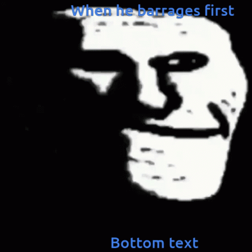 A classic troll face meme with the text 'When he barrages first' and 'Bottom text', related to Yba Your Bizarre Adventure.