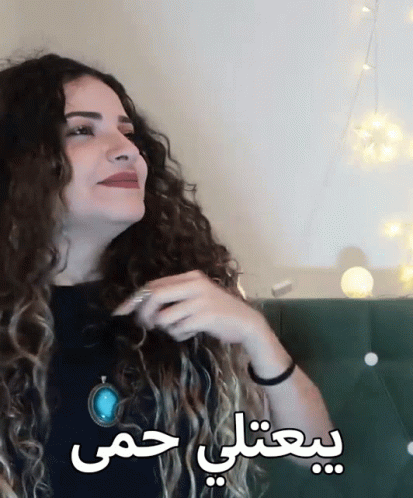 A woman with long curly hair and a blue stone necklace, with the Arabic caption 'يبعتلي حمى'.