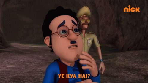 Ghasitaram from Motu Patlu looks confused and asks "Ye Kya Hai?" (What is this?) in a cave.
