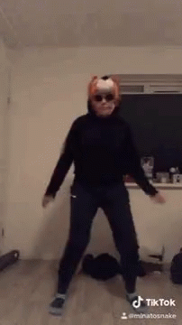 Joe, wearing a cat mask and sunglasses, performs a funny dance in a living room.