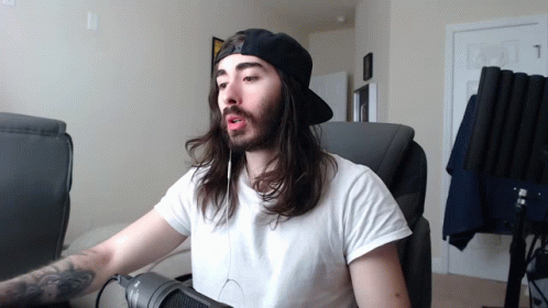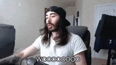 Moist Cr1tikal (penguinz0) reacts with an enthusiastic 'Yeah Baby' during a stream, raising his arms in excitement and celebration.