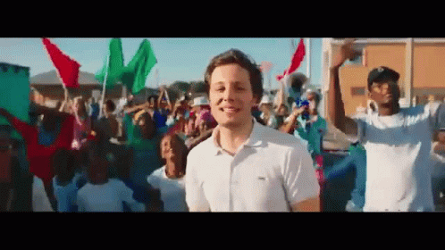 A man in a white polo shirt dances joyfully amidst a cheering crowd waving colorful flags at a vibrant festival.