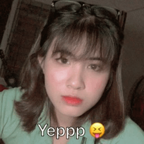 A cute girl with bangs and glasses on her head, smiling and making an expressive face while saying 'Yeppp'.