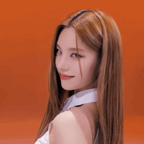 ITZY's Yeji captivates with a playful smirk and a quick tongue-out gesture against a vibrant orange background.