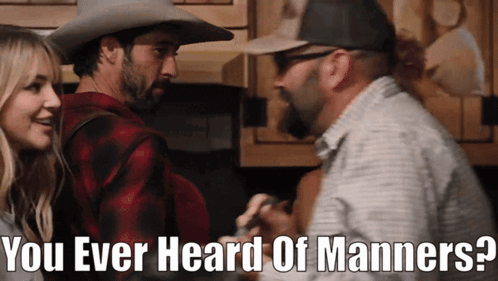 a man in a cowboy hat talks to a woman and another man with the words you ever heard of manners below him