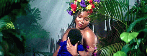 Yemi Alade, adorned with a floral crown, tenderly holds a baby in a lush, tropical setting, embodying motherhood.