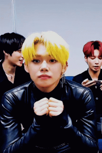 Yeonjun Choi Yeonjun making playful and cute poses for the camera, showcasing his distinctive yellow hair.