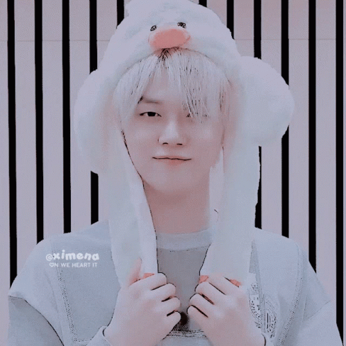 Yeonjun, from TXT, looking adorable in a white bunny hat with a pink nose, smiling sweetly.