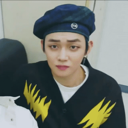 TXT member Yeonjun poses in a blue plaid beret and a black cardigan with yellow designs, looking intently at the camera.