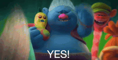 The Trolls characters cheer enthusiastically, with one holding a worm and exclaiming 'YES!' in a vibrant scene.