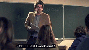 A man in a classroom enthusiastically celebrates the arrival of the weekend.