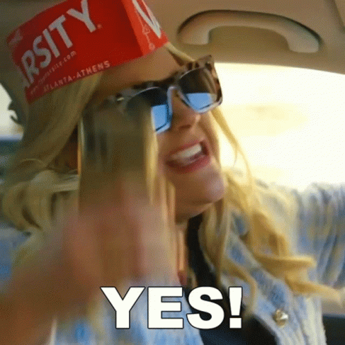 Heather McMahan excitedly shouts 'YES!' while wearing a Varsity hat and sunglasses in her car.