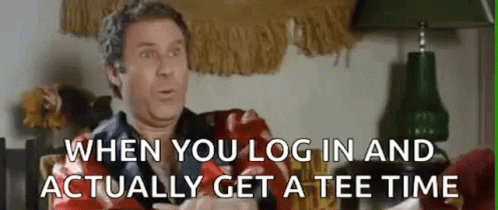 A man reacts with extreme joy when successfully logging in and securing a tee time for golf.