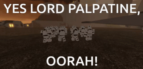 A group of stormtroopers chant 'Yes Lord Palpatine Oorah!' in a game-like setting, showing allegiance.