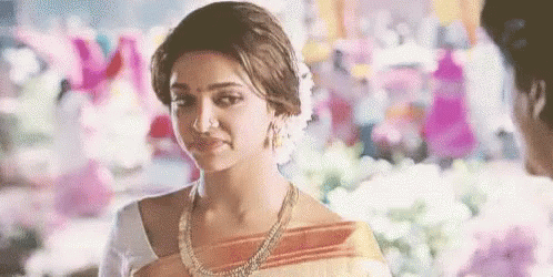 A woman in traditional Indian attire, wearing a nose ring and necklace, looks on with a thoughtful expression.