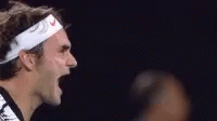 Roger Federer screaming in celebration on the tennis court after a successful win, wearing a white headband.