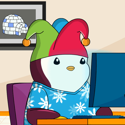 An animated Pudgy Penguin in a jester hat and snowflake sweater gives a thumbs up while sitting at a computer.