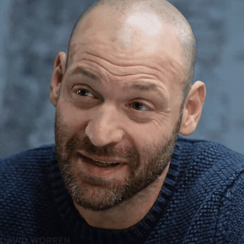 Corey Stoll, a bald man with a beard, expresses agreement with a 'Yes Yeah' while wearing a blue sweater.
