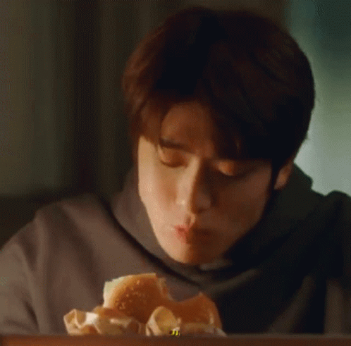 Jaehyun from Yestodays takes a big bite out of a delicious burger, enjoying his meal.