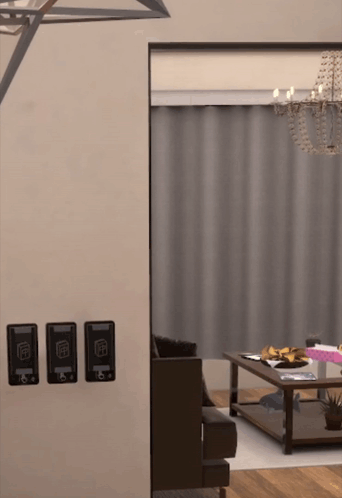 a living room with a couch a coffee table and a chandelier hanging from the ceiling