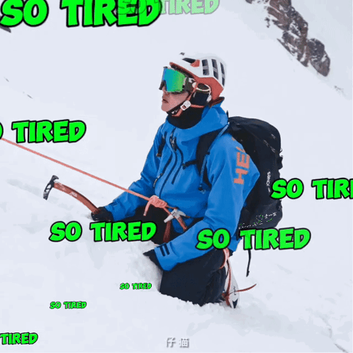 Wang Yibo, looking exhausted in a blue jacket, kneels in the snow surrounded by 'SO TIRED' captions.