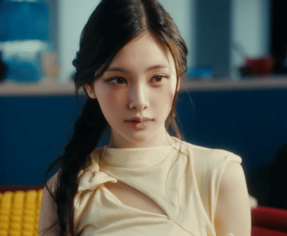 a close up of a woman 's face with a yellow shirt on