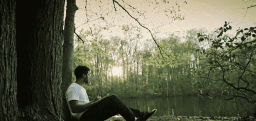 Mohamed Zeyara sits by a lake, leaning against a tree, enjoying the serene nature.