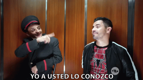 Man in an elevator tells another man, 'Yo a usted lo conozco' (I know you).