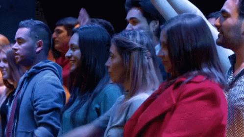 A group of people enthusiastically raising their hands in a dark room, smiling and engaged.