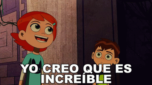 Gwen from Ben 10 reacts with excitement, exclaiming 'Yo creo que es increíble' while Ben looks on.