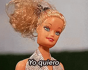 Close-up of a Barbie doll with 'Yo quiero' (I want) written on her, expressing desire.
