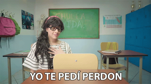 A woman in a classroom expresses an apology, with the caption 'Yo Te Pedí Perdón' visible on screen.