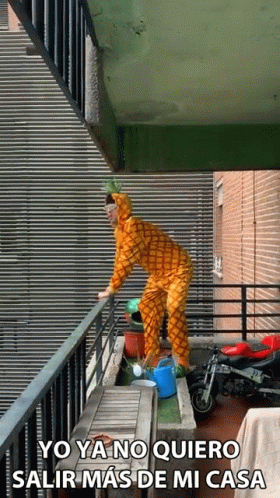Bejo, dressed in a full pineapple costume, dances on a balcony, expressing the sentiment 'I don't want to leave my house anymore'.