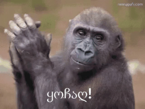 Gorilla claps and raises its hand, with the Georgian text 'Well done!' displayed.