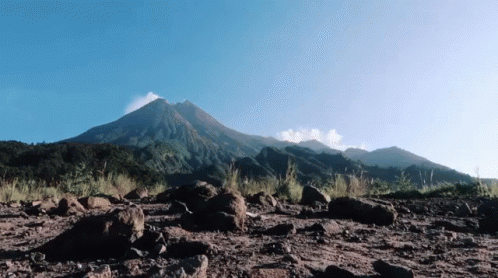 A person hiking towards the majestic Mount Merapi volcano in Yogyakarta, Indonesia, under a clear blue sky.