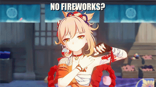 Yoimiya from Genshin Impact reacts to 'NO FIREWORKS?' with a disappointed expression.
