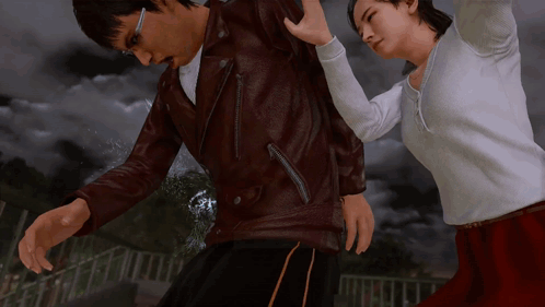 a man in a leather jacket stands next to a woman in a white shirt