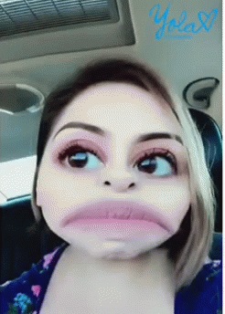 Yolamigas makes funny faces with a filter in a car, looking grumpy and playful with exaggerated features.
