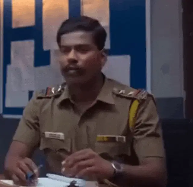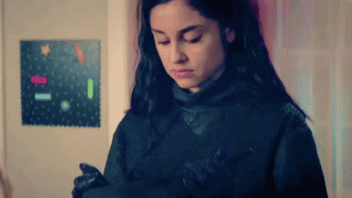 Yolanda Montez, as Wildcat, wearing gloves, looks at her phone then sniffs her gloved hand.