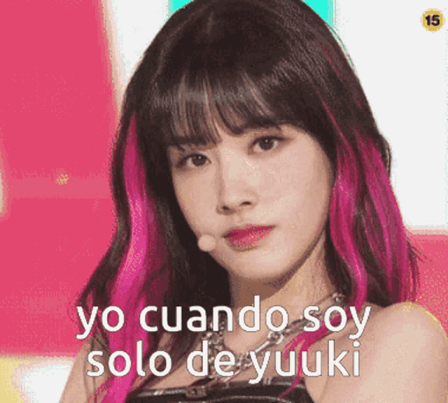 Yoon from STAYC shows cute expressions in this clip, with the Spanish caption 'me when I'm only Yuuki's'.