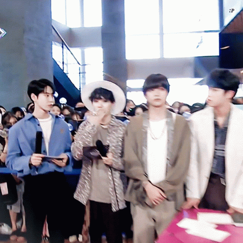 Suga (Yoongi) blows a kiss and smiles charmingly at the camera during an event, holding a microphone.