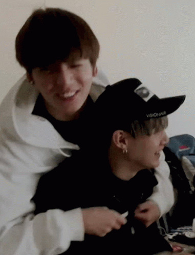 Jungkook affectionately hugs Suga from behind, both smiling happily in a sweet Yoonkook moment.